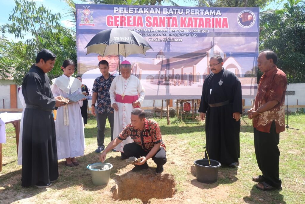 Bengkayang Post-(Landak). Peletakan Batu pertama Gereja Santa Katarina Paroki Santo Paulus dari Salib Mandor, Keuskupan Agung Pontianak, yang dibuka langsung oleh Sekretaris Daerah Kabupaten Landak Vinsensius, S.Sos,.MMA dan diberkati oleh Uskup Agung Pontianak Mgr. Agustinus Agus,Pr, di halaman Gereja Santa Katarina, Kamis (15/06/2023).