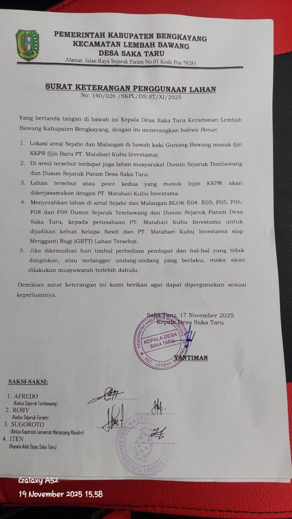 Tidak cukup pada penjelasan peta, Sugoroto, kemudian keluarkan lagi pernyataan penggunaan lahan dari kepala Desa Saka Taru, berikut surat yang di tunjukan Sugoroto: