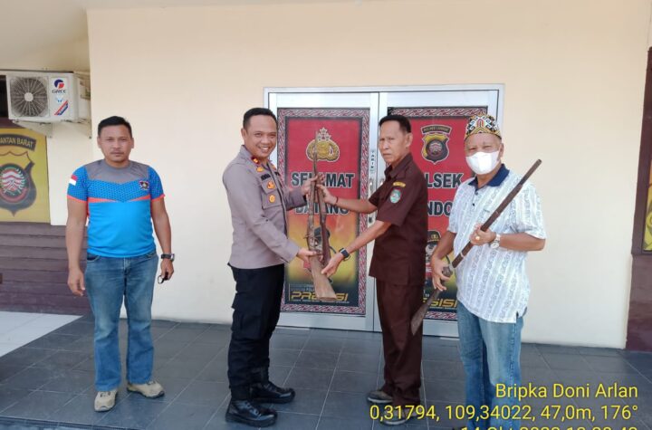 Bengkayang Post-(Mandor). Sejumlah warga melakukan penyerahan senjata api rakitan di halaman Mapolsek Mandor pada hari Jum'at siang ( 14/10/2022). Penyerahan...