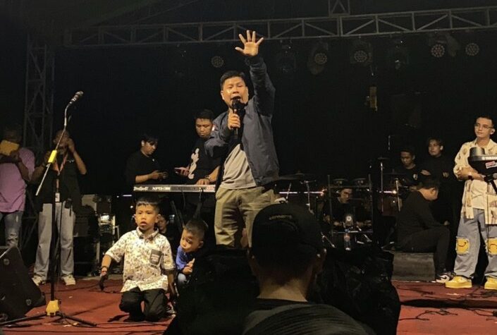 Bengkayang Post-(Sambas). Bupati Sambas, Satono, menyapa ribuan penonton dari atas panggung Lala Kuli Festival 2022 saat acara hiburan musik di...